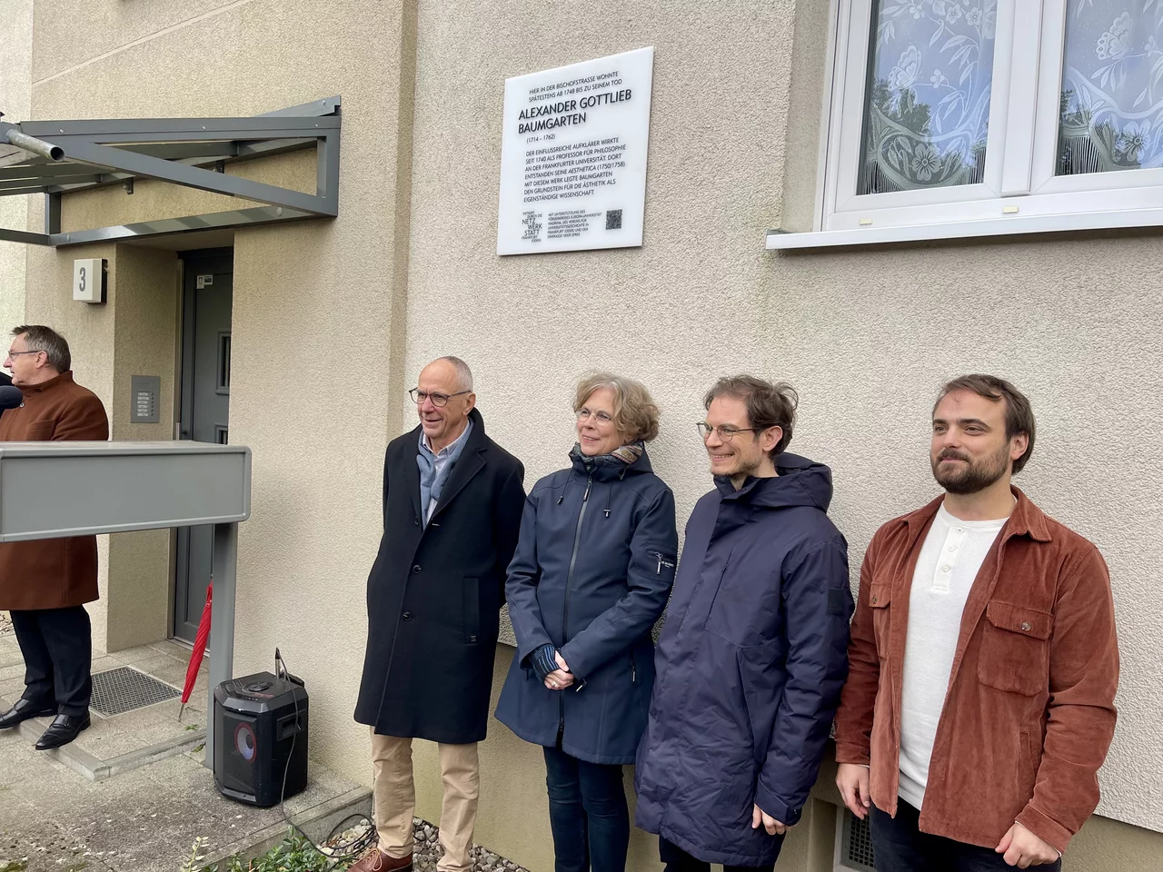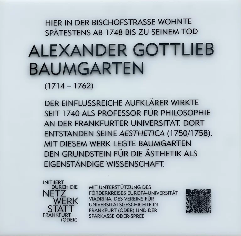 Am Freitag, dem 17. Oktober, wurde in der Bischofstraße 3 in Frankfurt (Oder) eine Gedenktafel für den bedeutenden Aufklärungsphilosophen Alexander Gottlieb Baumgarten (1714–1762) enthüllt. Die Tafel erinnert an das Wohnhaus des Gelehrten, das sich einst ganz in der Nähe dieser Stelle befand und heute nicht mehr erhalten ist.