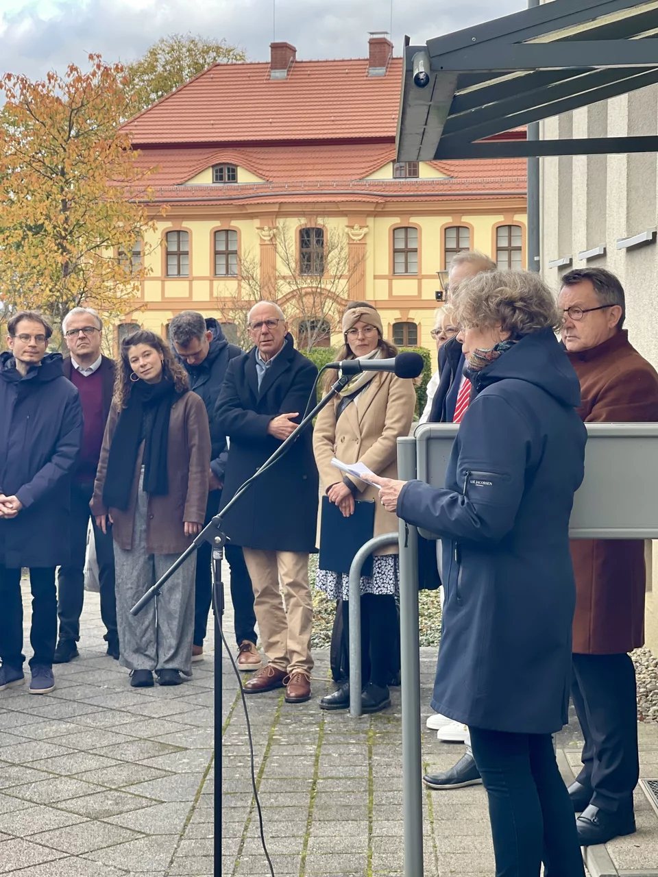 Zur feierlichen Enthüllung begrüßte Prof. Dr. Gangolf Hübinger von der Netzwerkstatt Frankfurt (Oder) die Anwesenden. Es folgten Grußworte der Wohnungswirtschaft Frankfurt (Oder) sowie des Förderkreises Europa-Universität Viadrina. Die Laudatio hielt Prof. Dr. Andrea Allerkamp von der Europa-Universität. Sie würdigte Baumgarten als Wegbereiter einer Philosophie der sinnlichen Erkenntnis. „Ästhetik ist die große Schwester der Logik“, zitierte sie aus seiner 275 Jahre alten Schrift.