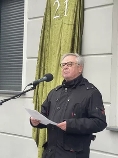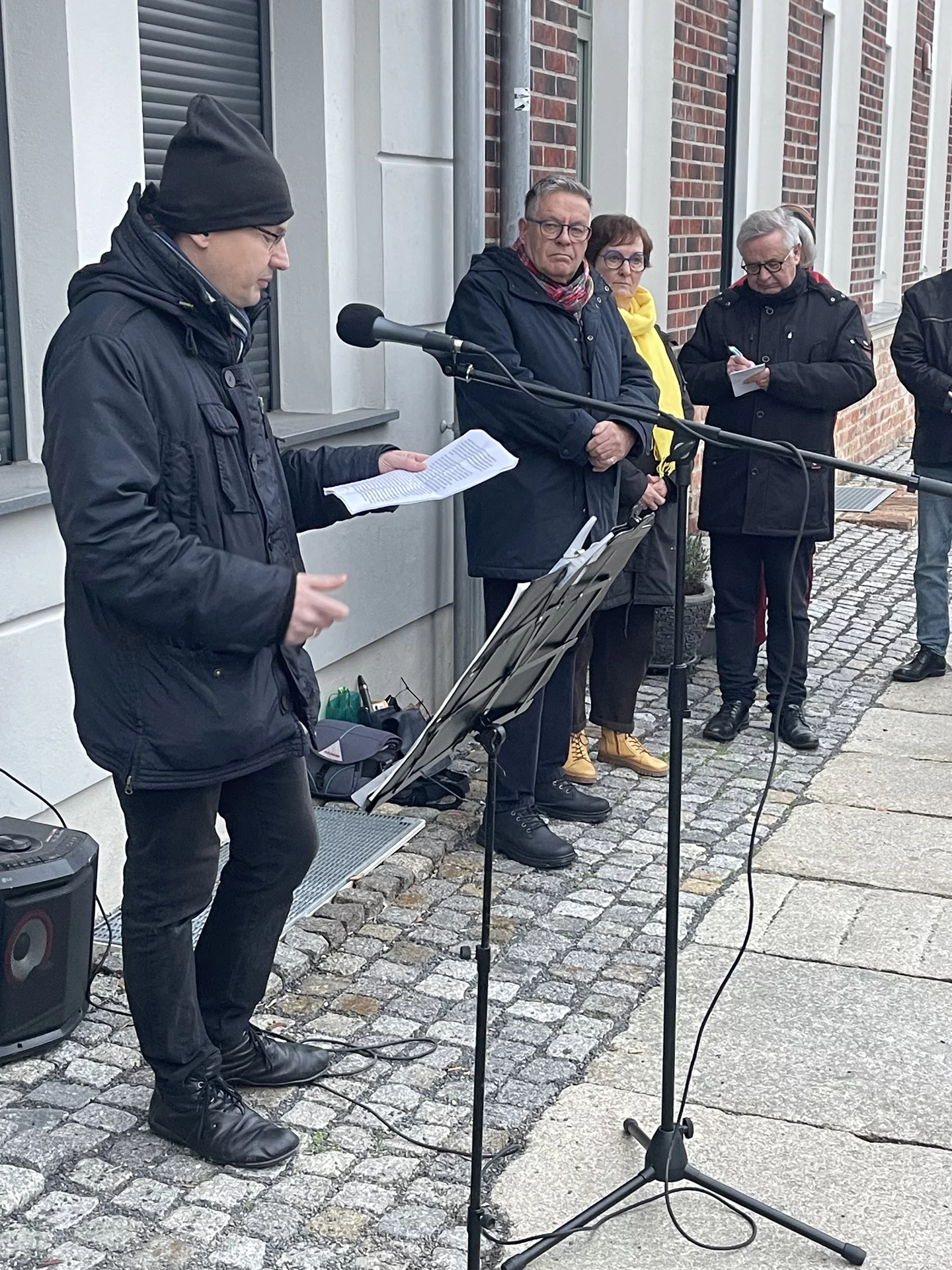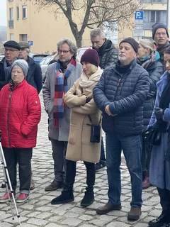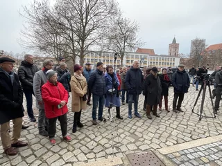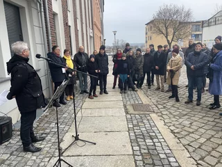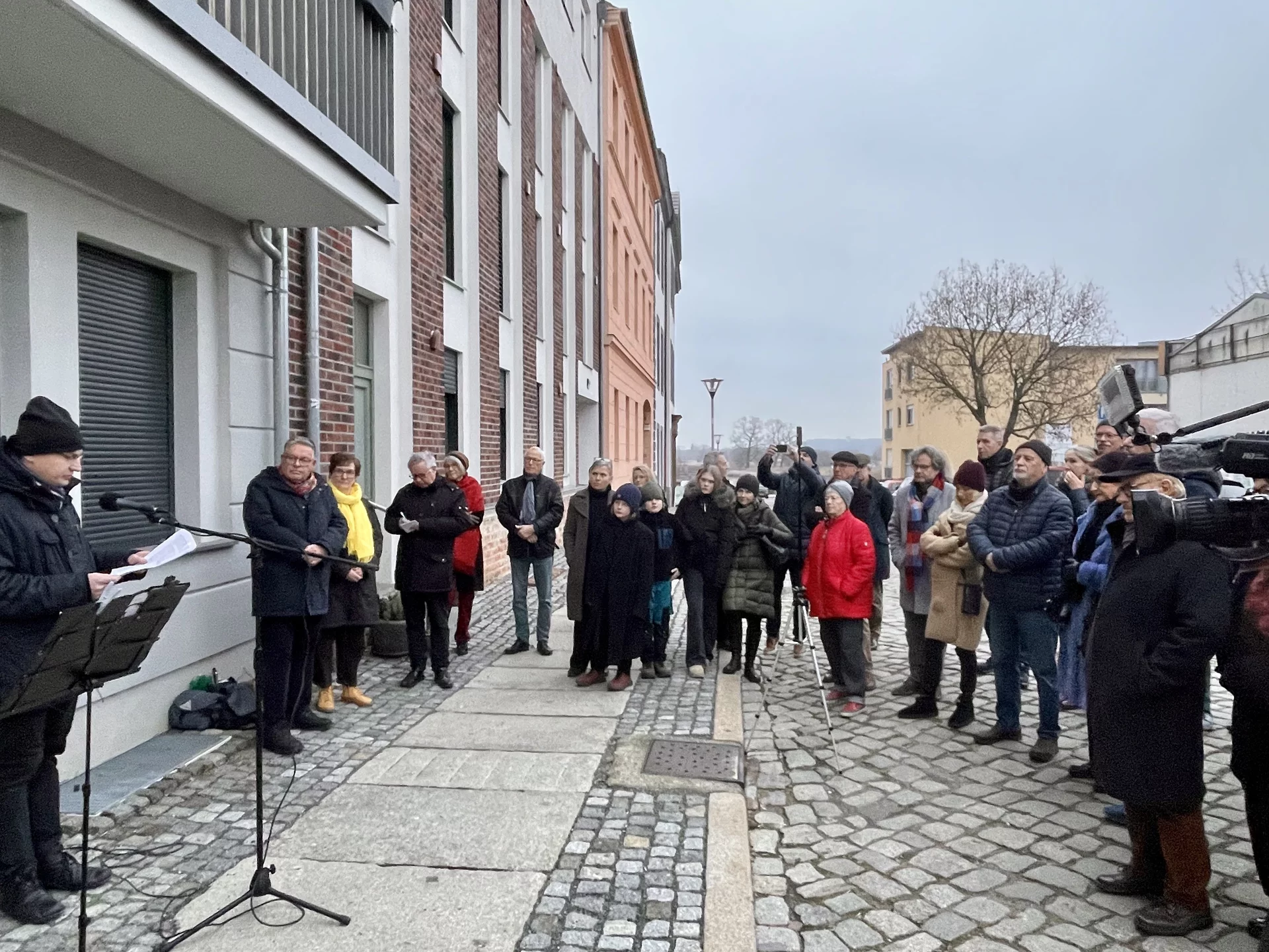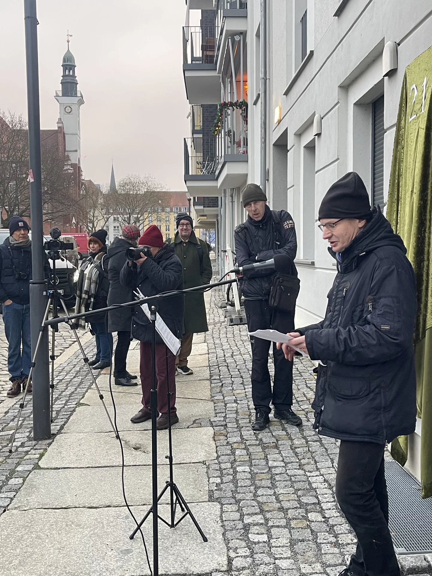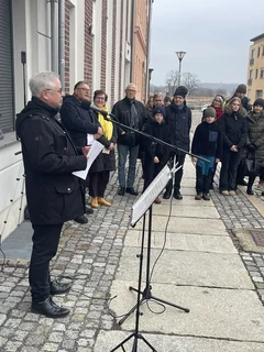 Nach der Enthüllung öffnete sich symbolisch auch das 21. Türchen des „Lebendigen Frankfurter Adventskalenders“. Bei Glühwein, Keksen und Stollen kamen die Gäste im Tordurchgang des Museums Viadrina ins Gespräch – über Bach, über weitere Erinnerungstafeln und über die Frage, wie Geschichte im Alltag präsent bleiben kann.