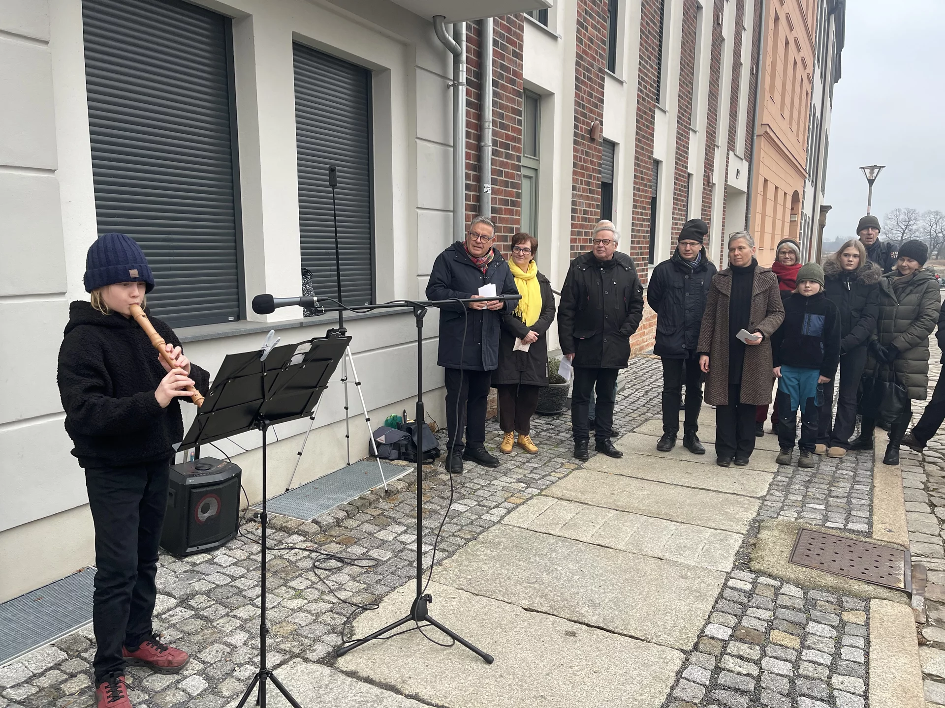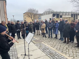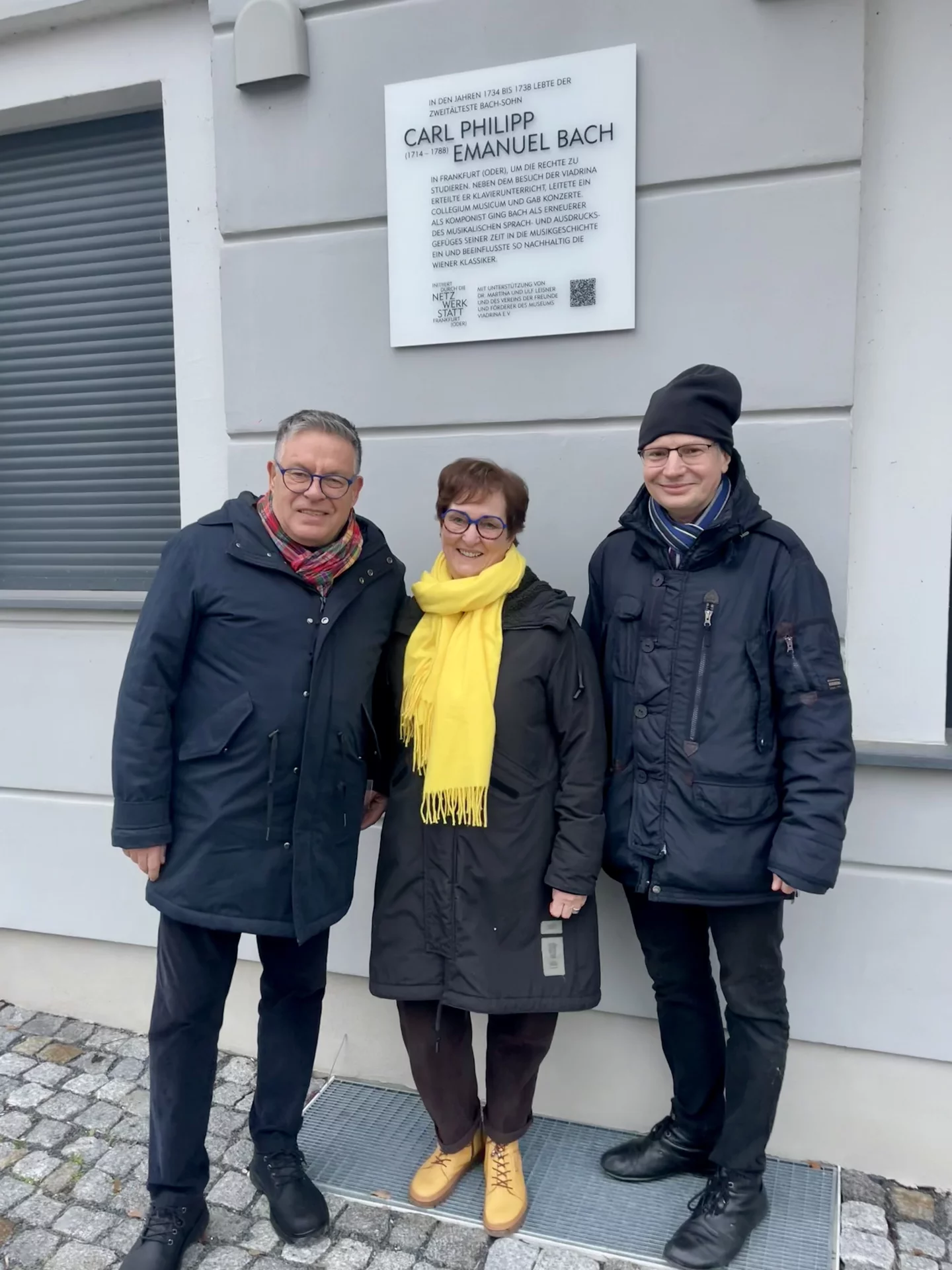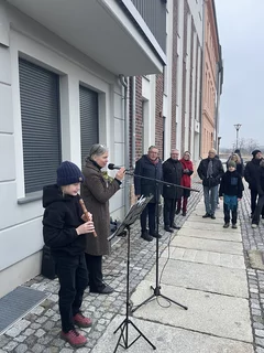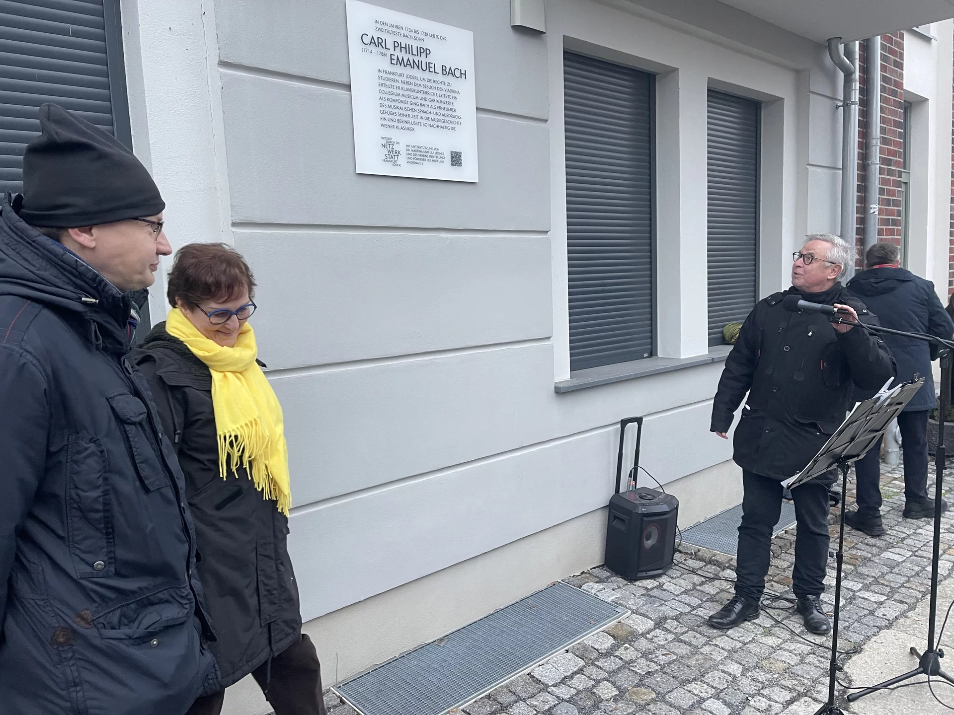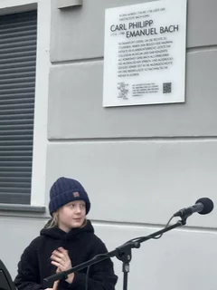 Mit leisen Tönen begann am 4. Adventsnachmittag eine besondere Stunde der Erinnerung. Rund 50 Gäste hatten sich in der Carl-Philipp-Emanuel-Bach-Straße 13, gleich neben dem Museum Viadrina, versammelt, um die neue Erinnerungstafel für Carl Philipp Emanuel Bach einzuweihen. Die Veranstaltung fügte sich stimmungsvoll in die Frankfurter Adventszeit ein. Schon die musikalische Eröffnung durch den Blockflötisten Balduin Tschäpe ließ die Klangwelt des Komponisten lebendig werden. Zarte, zurückhaltende Melodien erfüllten den Nachmittag – passend zu den Gedanken der Begrüßung, die bewusst auf große Worte verzichtete und stattdessen die Bedeutung der leisen Töne, der Besinnung und des gemeinsamen Erinnerns in den Mittelpunkt stellte.